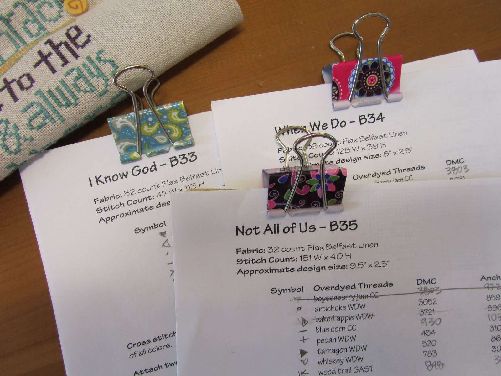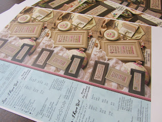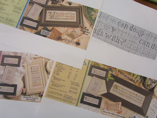 In addition to the photos, I give Janice files for the text and the cross stitch chart, and a print out of the text for each design (with symbols penciled in). I also give her the actual stitched models, because she likes to have them for reference (and inspiration) while she is working.