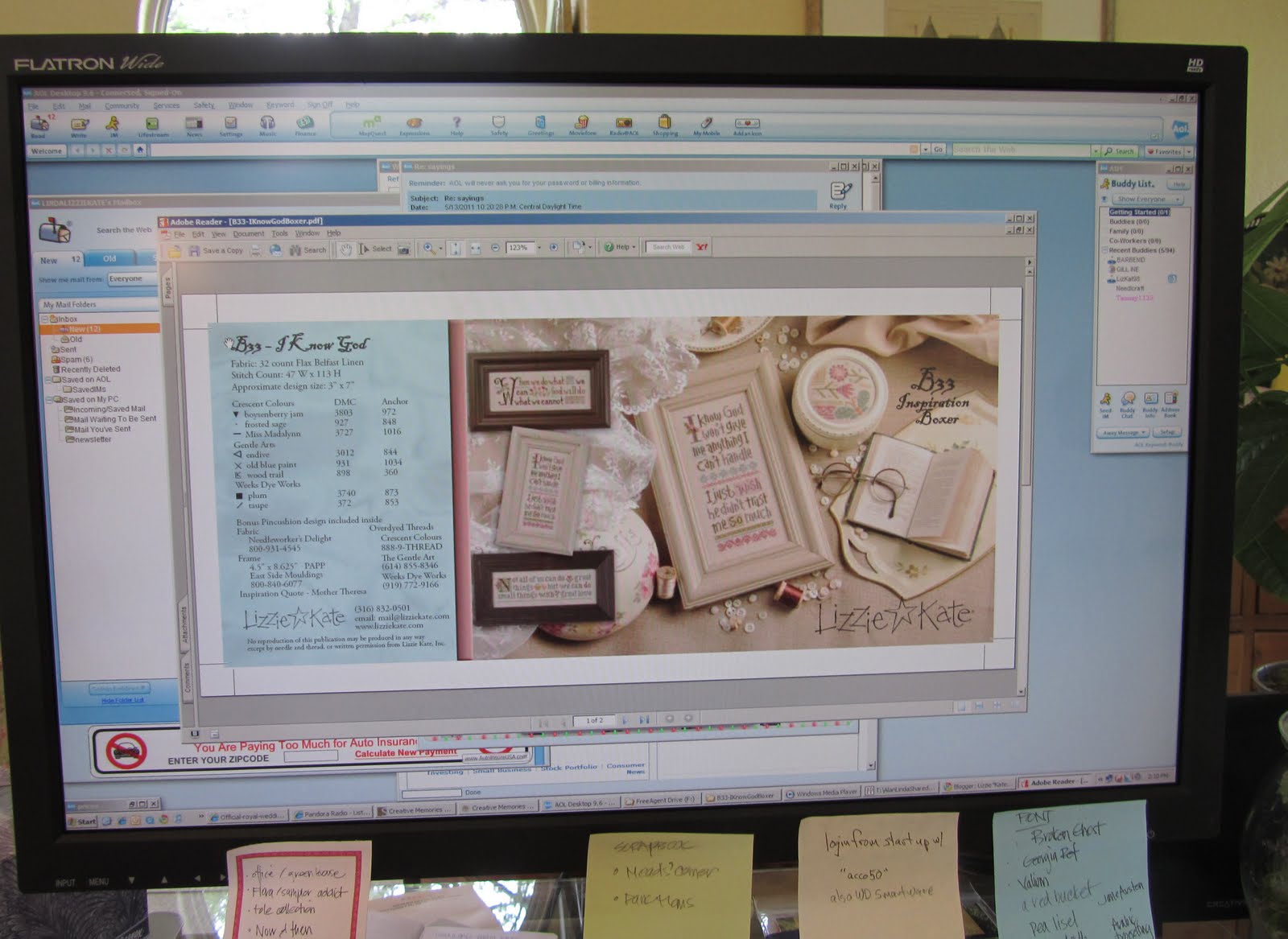 Below is my monitor with the file for the first Inspiration Boxer. You're seeing the front and back cover (unfolded, of course). The right side has the photo of the framed Boxer and the bonus pin cushion design. On the left you can see the back cover info, as well as the photo of all 3 Boxers in this inspirational series.