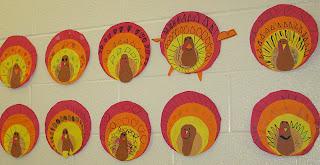 Speaking of turkeys, my daughter Sarah sent me this cute photo of some colorful turkeys that her K-2 students made this week in her art class. These gobblers are now decorating the halls of Medora, Indiana Elementary School!