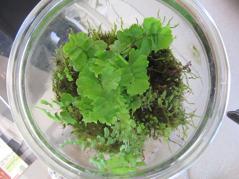 I bought a new baby fern for my desktop terrarium. It's a lot of happy for $2.99. I bought this terrarium a couple years ago when I was in Franklin, Tennessee for our annual February market. I hope to snag another one at the same cute store next year. It's low maintenance, no worry, happy desk material! Just keep the lid on and leave it...all that photosynthesis stuff you learned in 7th grade biology!
