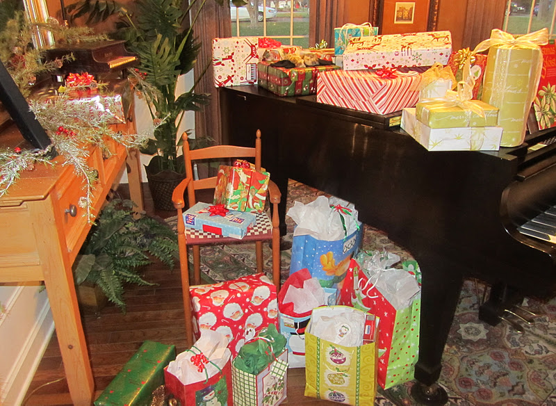 I'm the coordinator for this year's effort, so it's looking a bit like Santa's workshop in my piano room. I am piling the presents in here, so they don't get mixed up with our family gifts.