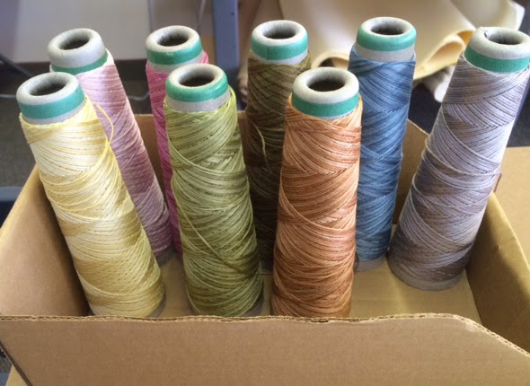 and they've been transformed...measured, snipped and coiled into little 3" x 3" thread packs. Alan has perfected an ingenious method of pulling all 8 colors at once. Still, it's a lot of work!