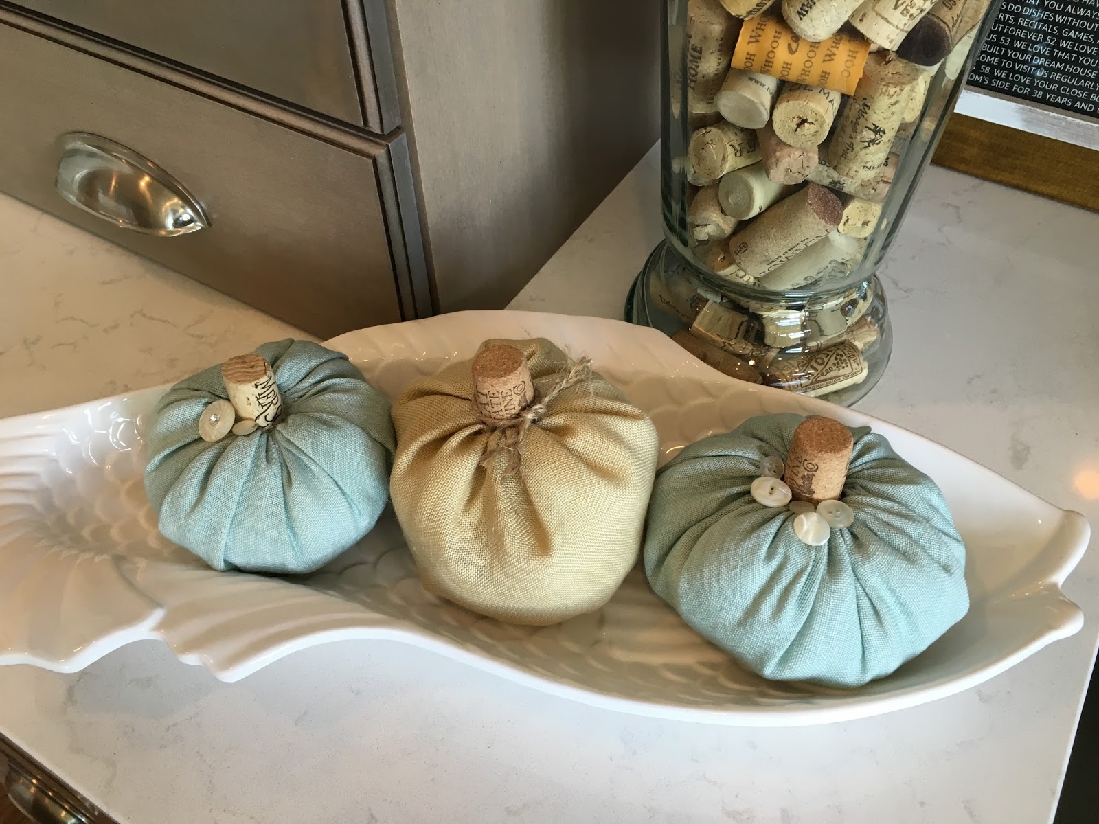 A trio of pumpkins on my drink station in my kitchen. Seemed an appropriate place for the wine cork stems.
