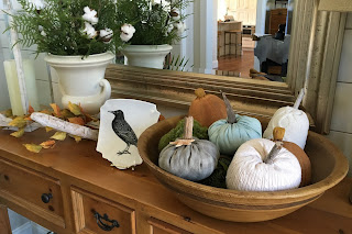 A couple new pumpkins join some old pumpkins in entry hall. The creamy recycled sweater pumpkins were my DIY project last year. So easy - check Pinterest!